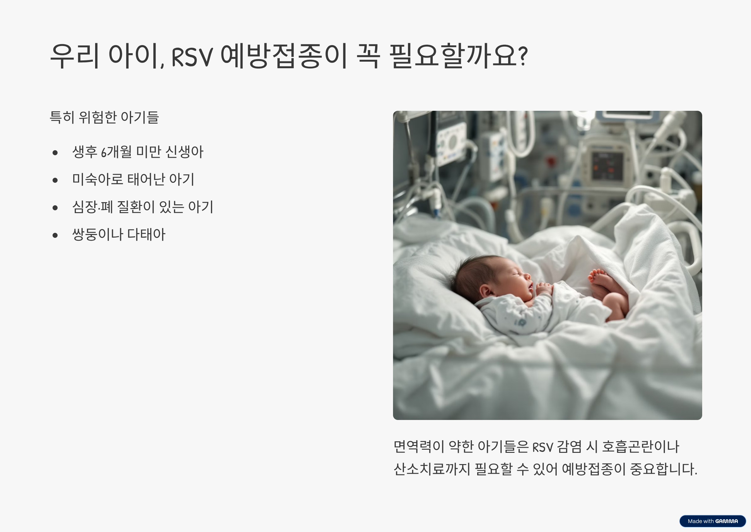 - RSV 예방접종은 아직 국가 필수 예방접종에 포함되어 있지 않으므로, 출산 계획 중인 산모와 가족이 직접 병원 예약 및 비용 부담을 확인해야 한다.