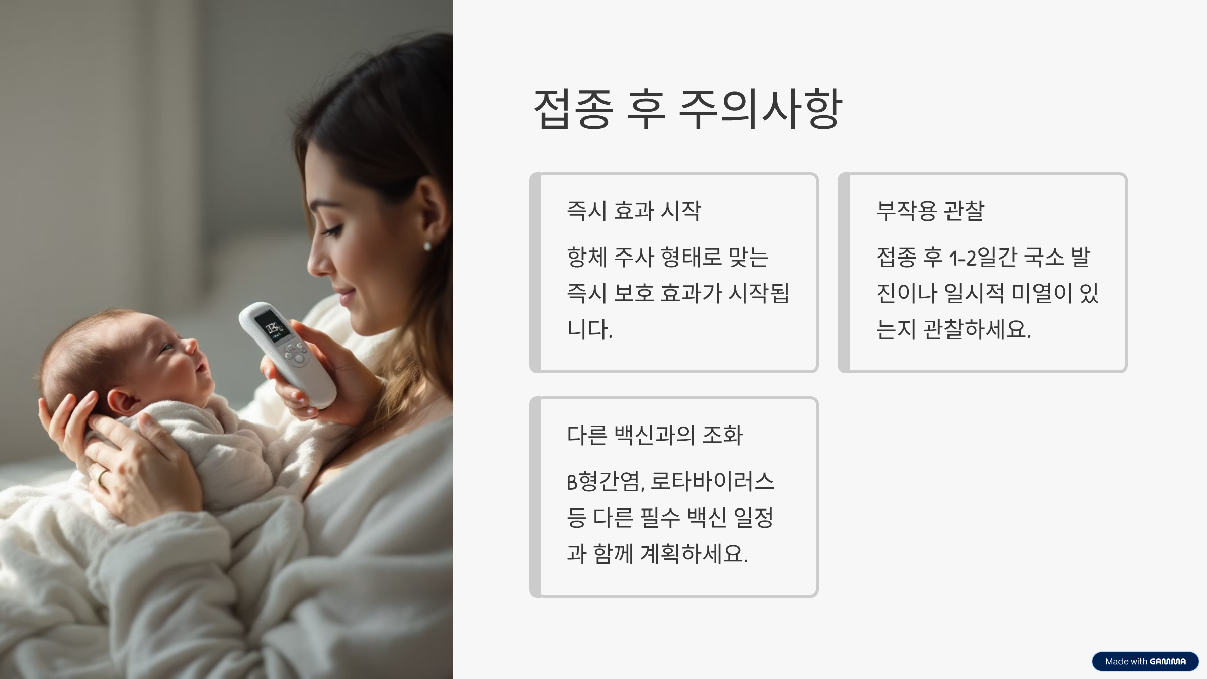 - RSV 예방접종은 일회성 항체 주사로 맞은 즉시 효과가 시작되지만, 접종 후 부작용(국소 발진, 일시적 미열)이 소수에서 발생할 수 있으니 접종 1~2일간은 아기의 건강상태를 면밀히 관찰해야 한다.