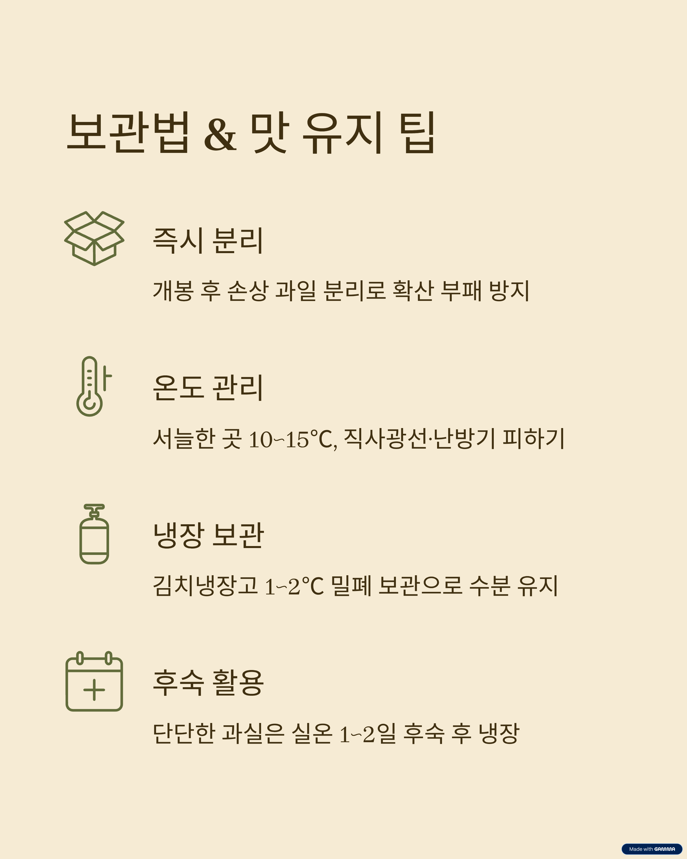 - 박스 개봉 즉시 손상 과일은 분리(확산 부패 방지).