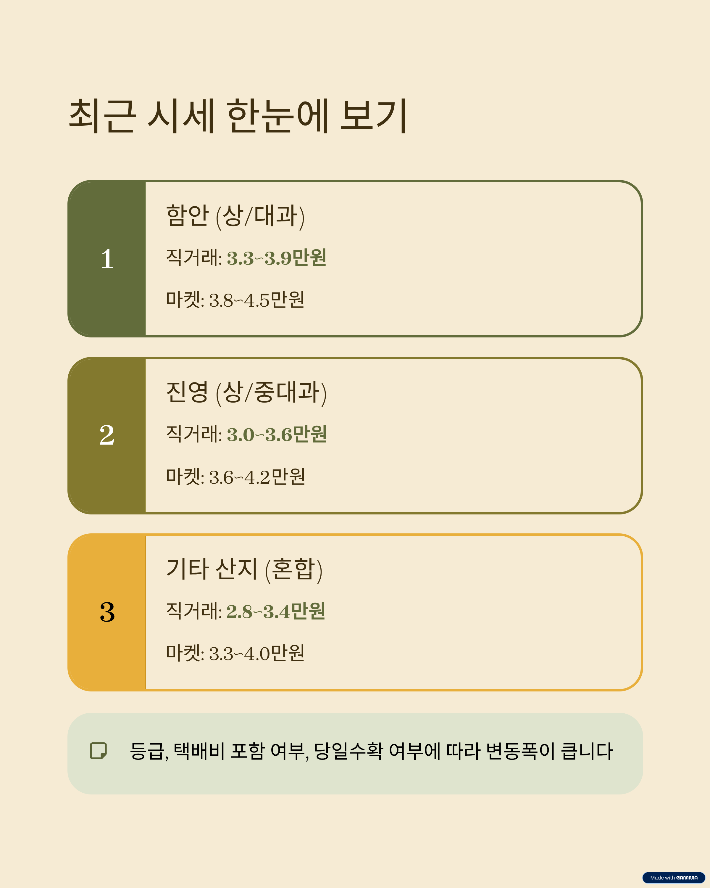 - 함안(상/대과): 직거래 3.3~3.9만 / 마켓 3.8~4.5만