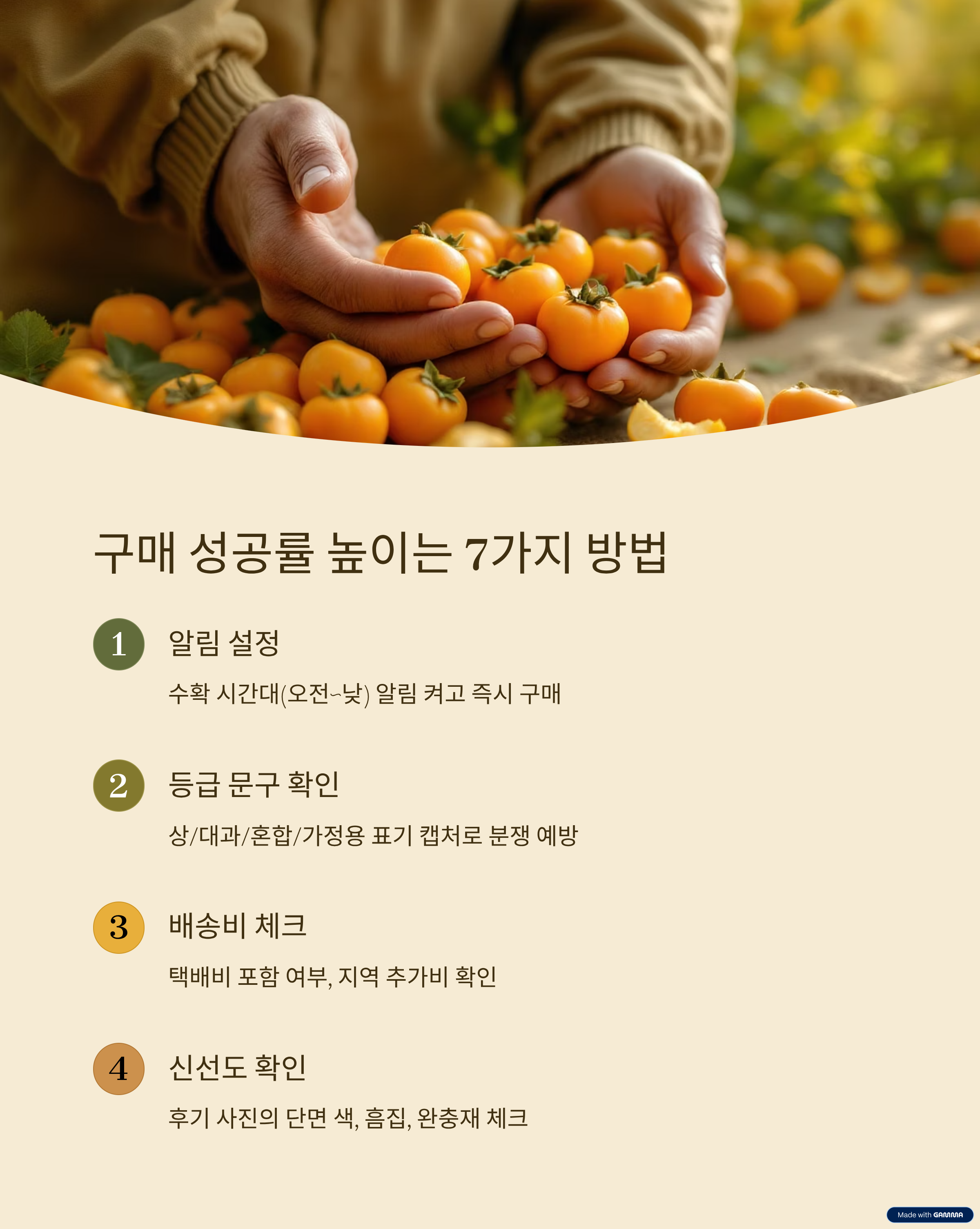 - 알림 설정: 수확·출하 시간대(오전~낮)에 맞춰 알림 켜고 올라오자마자 구매.