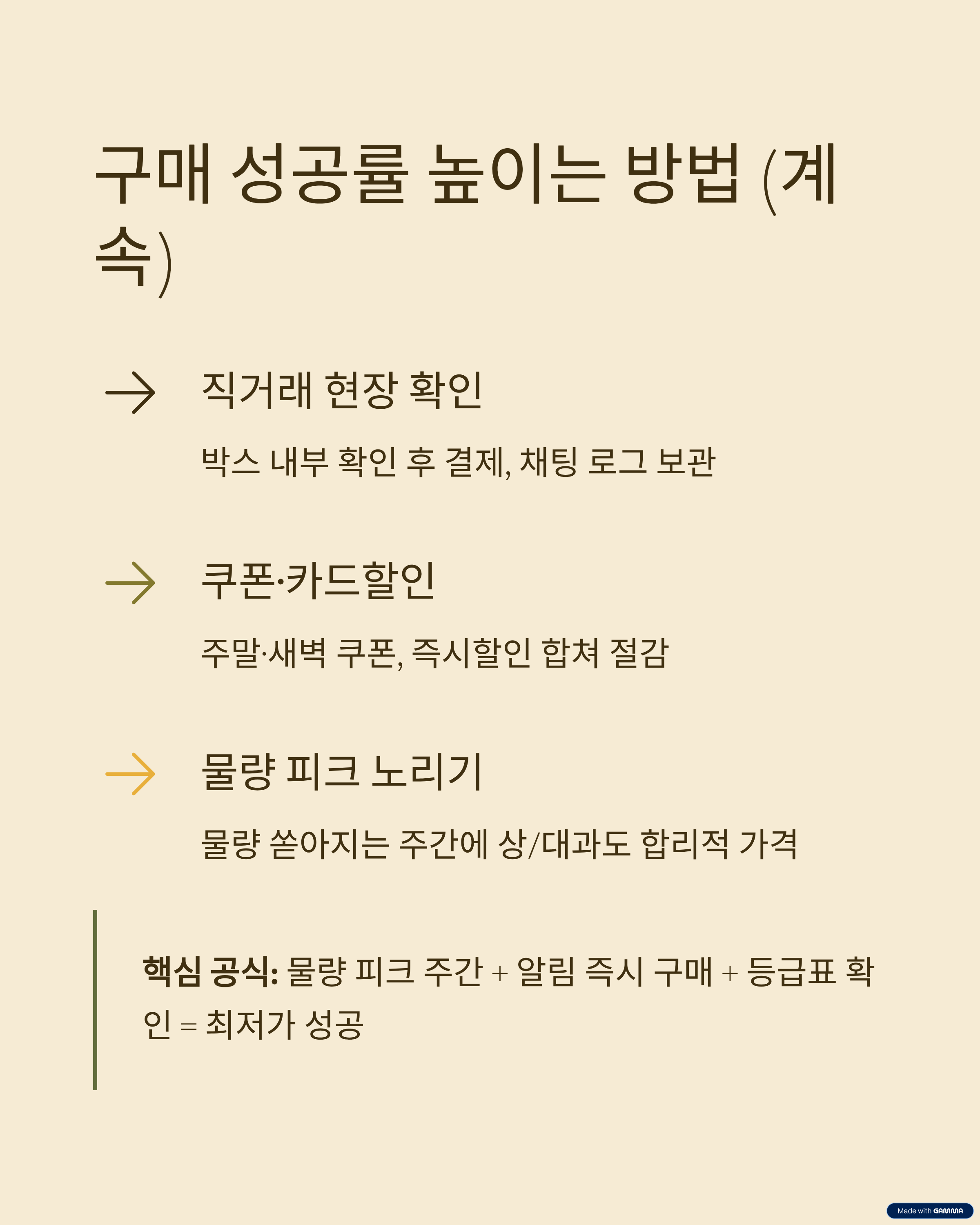 - 빠른 결론: “물량 피크 주간 + 알림 즉시 구매 + 등급표 확인”이 최저가를 잡는 핵심입니다.