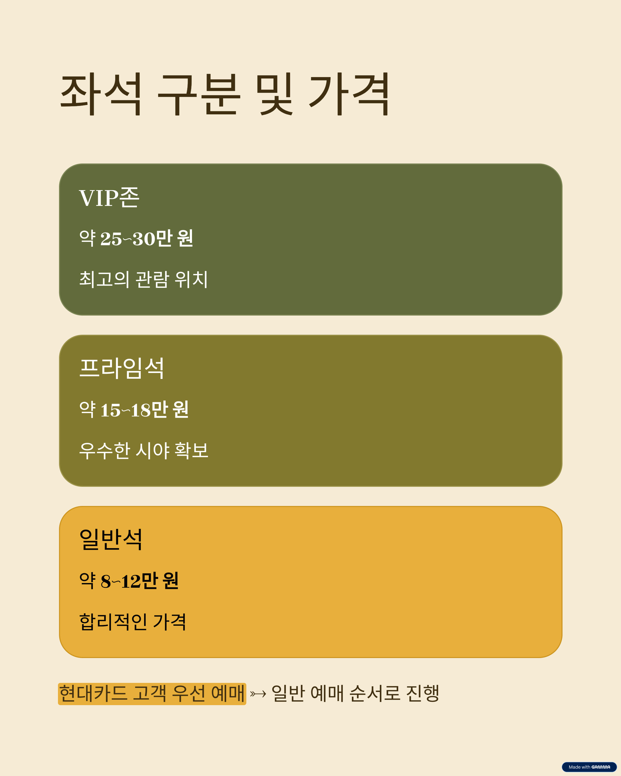특히 현대카드 소지자는 1~2일 먼저 선예매가 가능하며, 좌석별 매진 속도 차이가 크기 때문에 티켓팅 시 빠른 접근이 중요합니다.